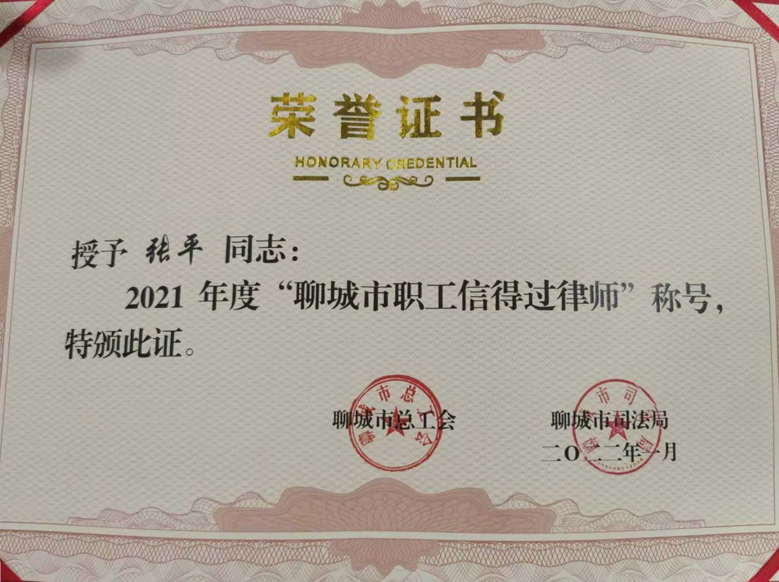 2021年12月,聊城市總工會(huì)、聊城市司法局開展了“聊城市職工信得過律師”評(píng)選活動(dòng)。經(jīng)過公開、公正評(píng)審選拔等程序,由市財(cái)金公司推選的張平同志成功入圍并獲得“2021年度聊城市職工信得過律師”榮譽(yù)稱號(hào),市總工會(huì)和市司法局予以通報(bào)表揚(yáng),并頒發(fā)榮譽(yù)證書。